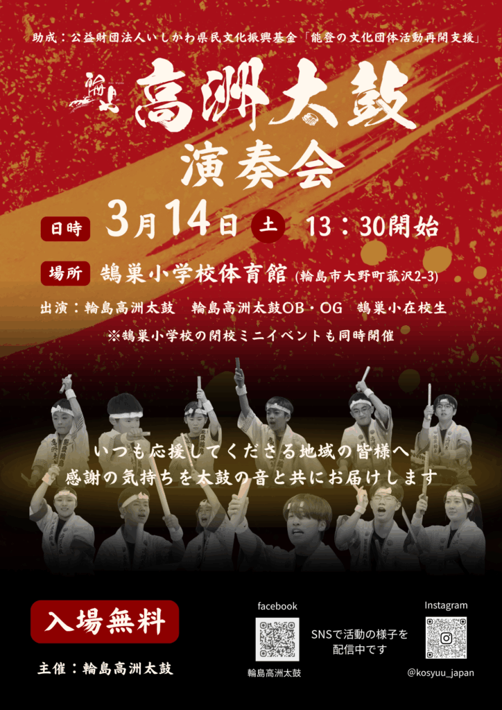 ◼︎輪島高洲太鼓演奏会のお知らせ◼︎